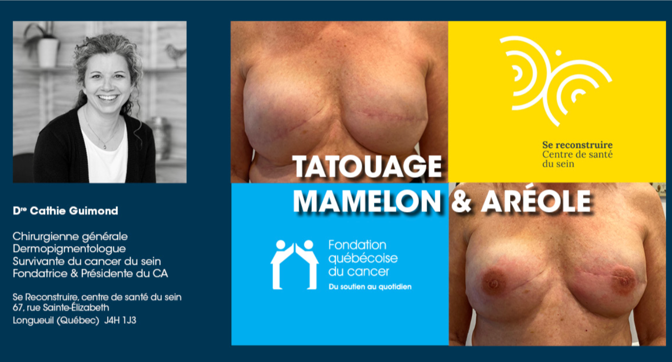 Comme le tatouage est effectué avec la Dre Cathie Guimond, chirurgienne & survivante, le geste de reconstruction du complexe aréolo-mamelonaire par dermopigmentation (tatouage) est un acte médical. Il est donc couvert à 100% par la RAMQ avec une consultation médicale par n’importe quel médecin
